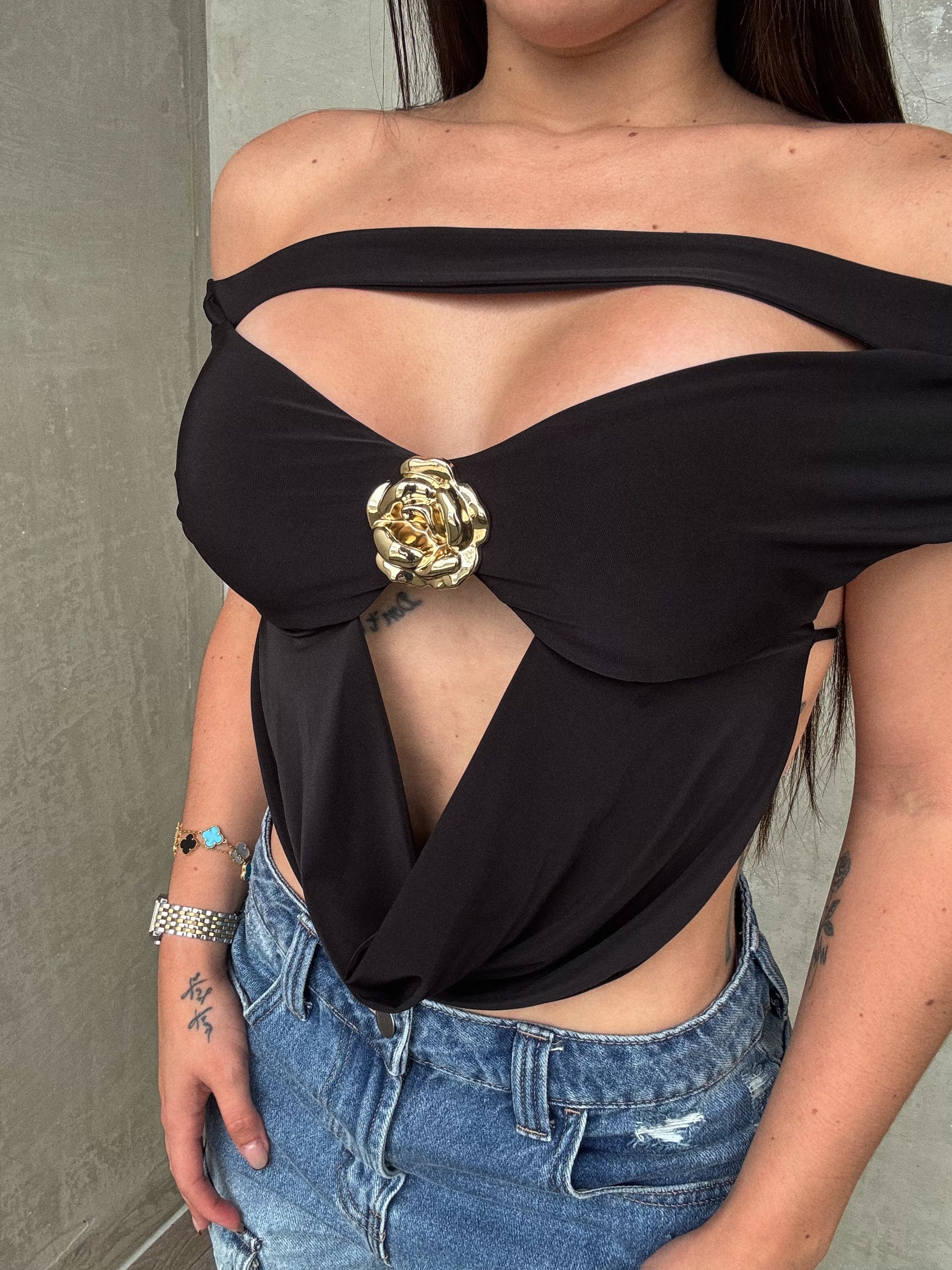 Black Halter Top W. Gold Flower
