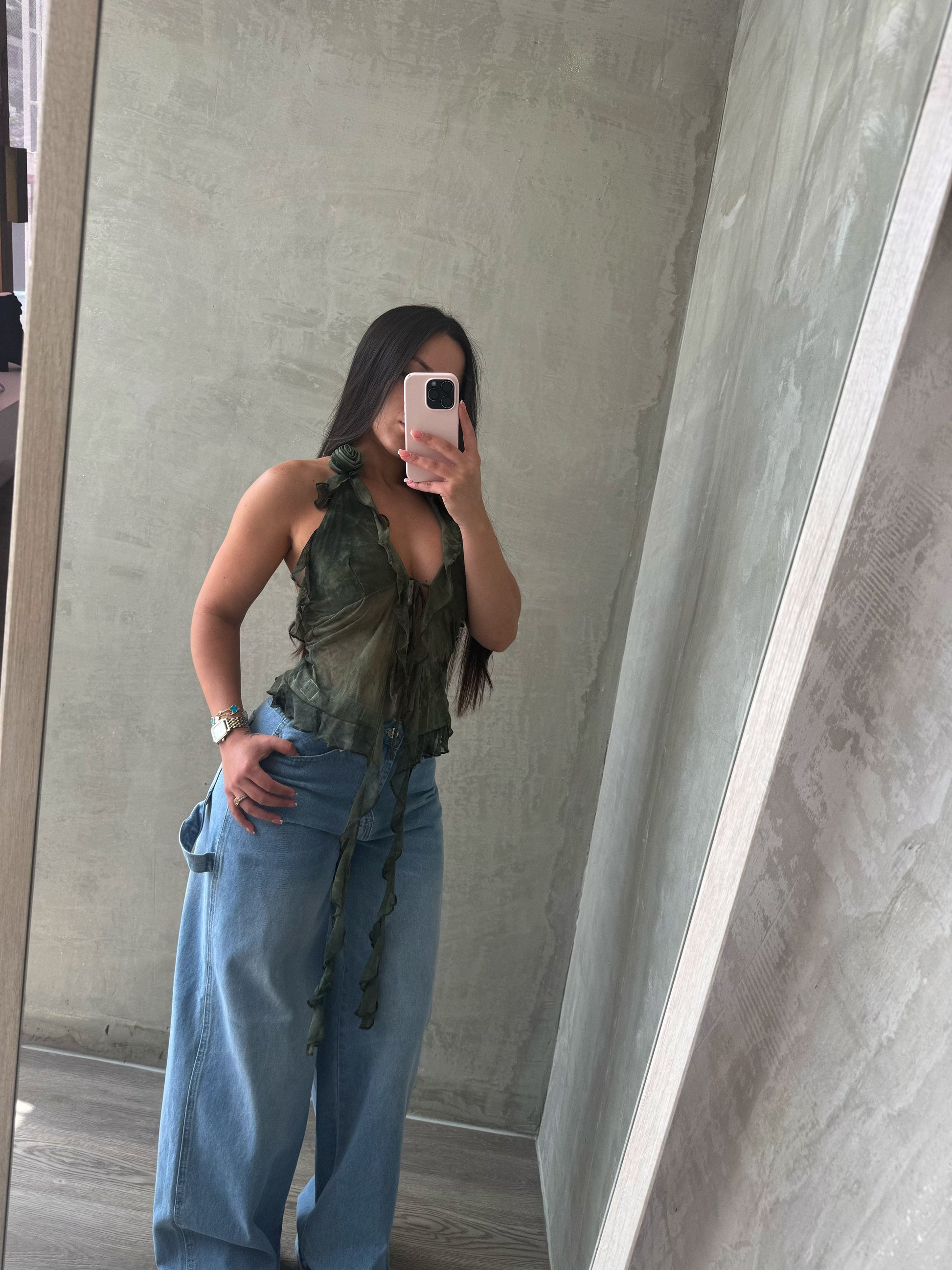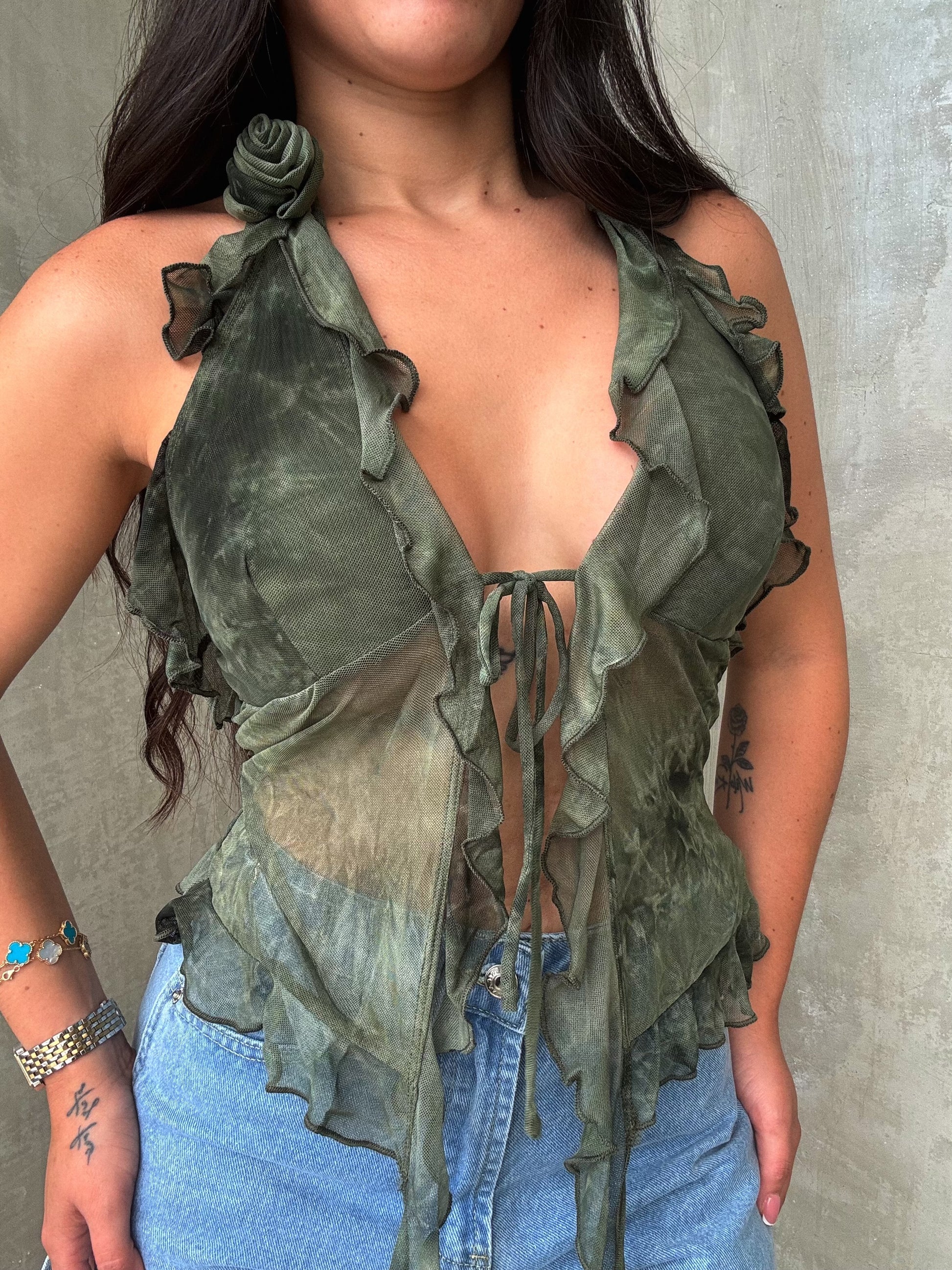 Olive Mesh Ruffled Top